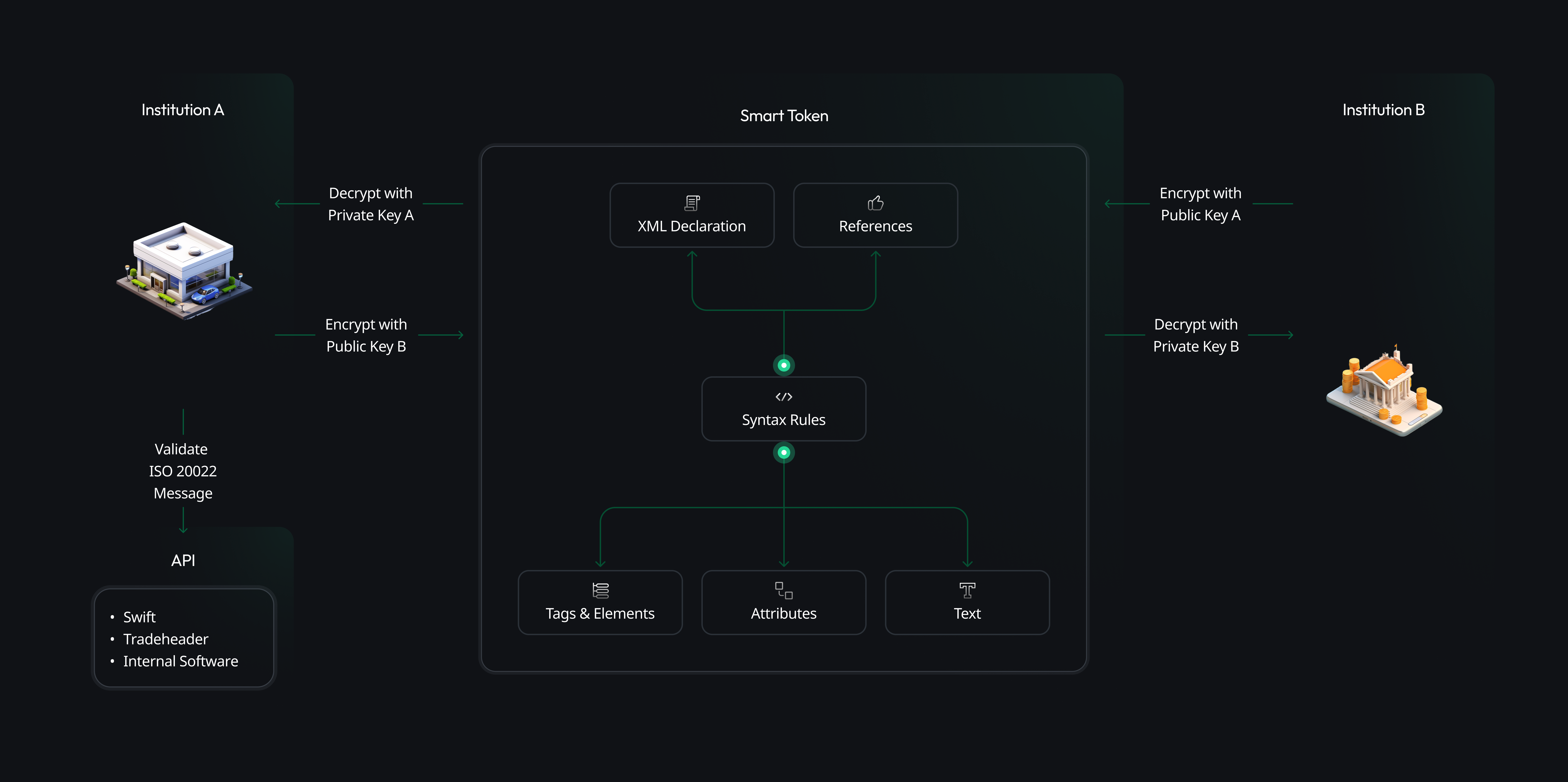 Institution A validates the message against the ISO 20022 standard, a messaging standard that enables the electronic exchange of information in the financial industry.
